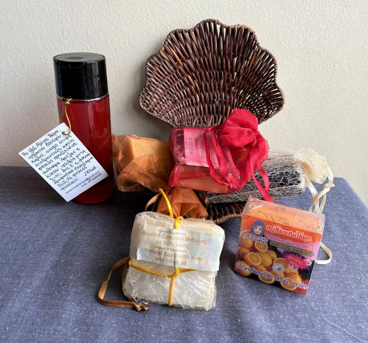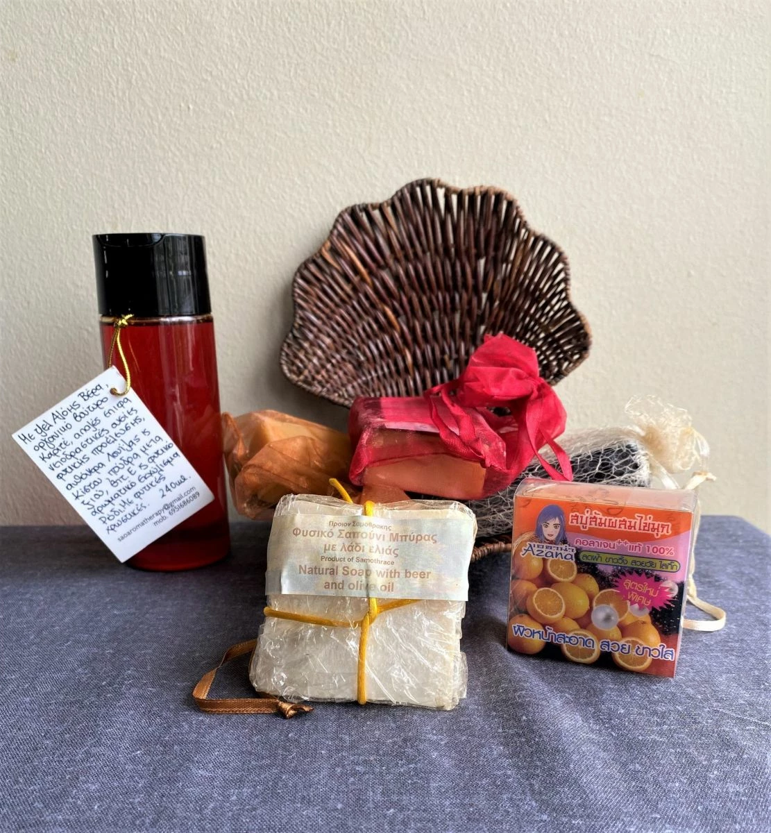 5 οικολογικά χειροποίητα σαπούνια και Shower gel με αγνά υλικά + δώρο ψαθινη βάση σε σχήμα κοχυλιού
