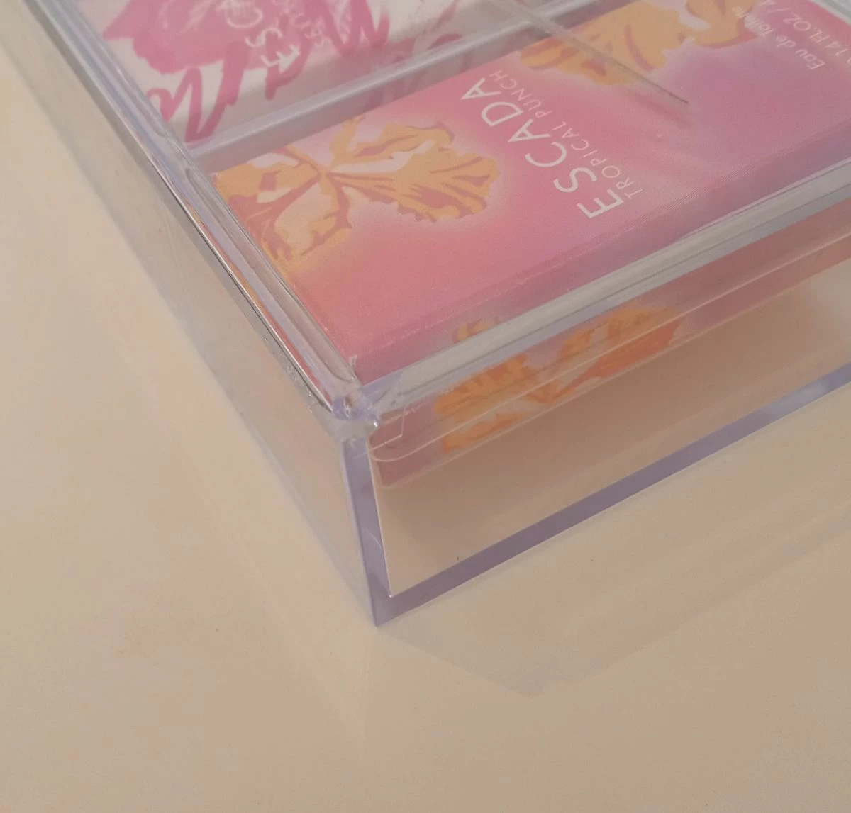 κουτί απο plexiglass το οποίο έχει ένα πολύ μικρό χτύπημα στη γωνία και σημάδι το
