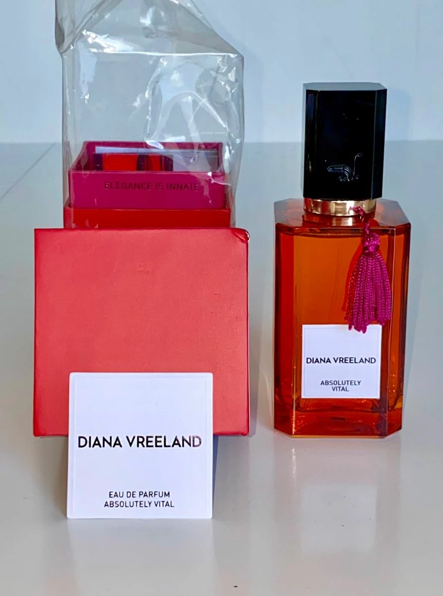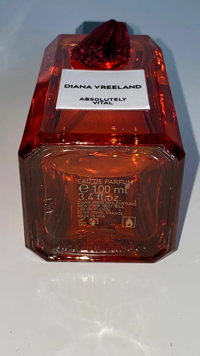 Absolutely Vital από Diana Vreeland είναι ένα Αμπερι Λουλουδενιο άρωμα. Νότες αρωμάτων είναι σανδαλόξυλο, κόκκινο τριαντάφυλλο Τουρκίας, μύρο, οποπόναξ, Βανίλια και Αιγυπτιακό γιασεμί. Καινούριο χωρίς ένα δοκιμαστικό ψεκασμό, 100μλ. Αγορασμένο απο Ελβετία.