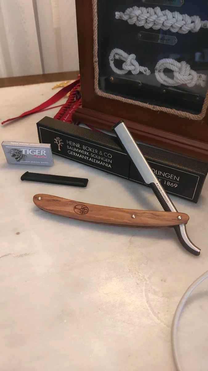 Boker σαββετα ξυρισματος olive wood scales με έξτρα plastic blade holder για μακριές λεπίδες.