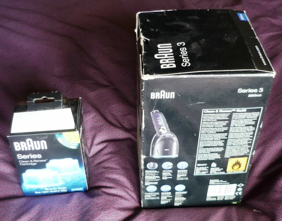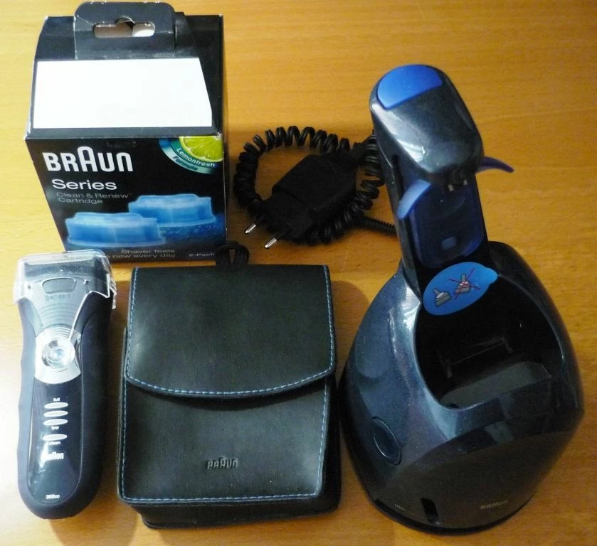 Ηλεκτρική ξυριστική μηχανή Brown Series 3, 350cc με την δερμάτινη θήκη της, τη βάση φόρτισης και καθαρισμού και extra 2 cartridges με ειδικό υγρό καθαρισμού.