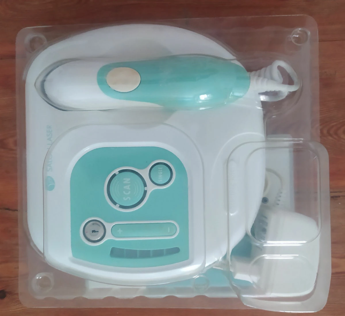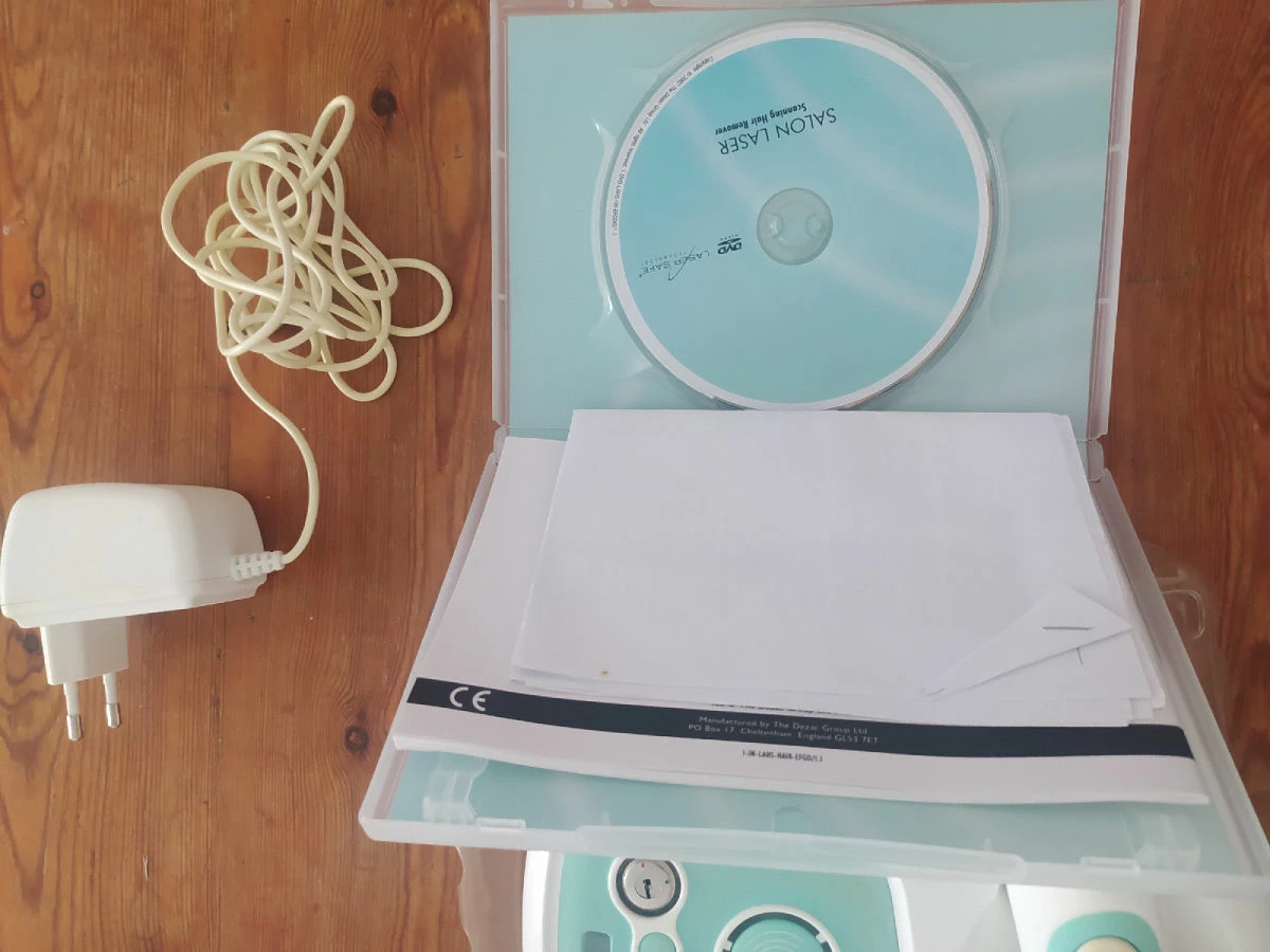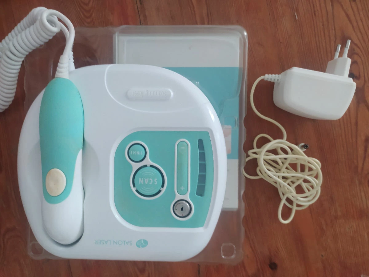Συσκευή φωτόλυσης για ατομική χρήση, με διαβαθμίσεις έντασης κ επιλογή scan/single hair. Στο κουτί της με το κλειδι ενεργοποίησης, όλες τις οδηγίες κ το dvd. Λειτουργεί κανονικά, μόνο που τα μαλακά πλαστικά της συσκευής έχουν πλέον αποχρωματιστεί οπως φαίνεται κ στις φωτογραφίες. Έτος αγοράς 2008.