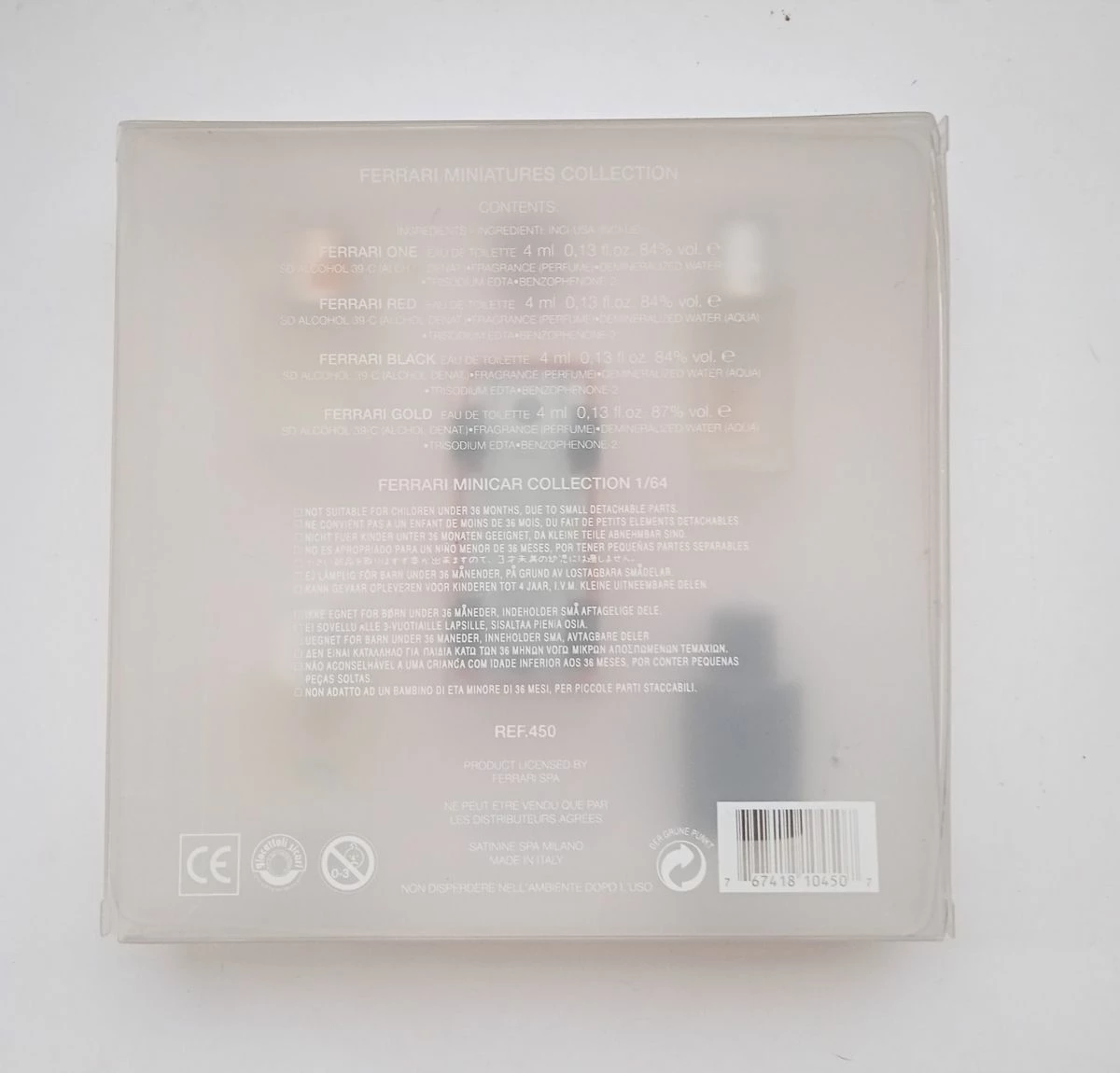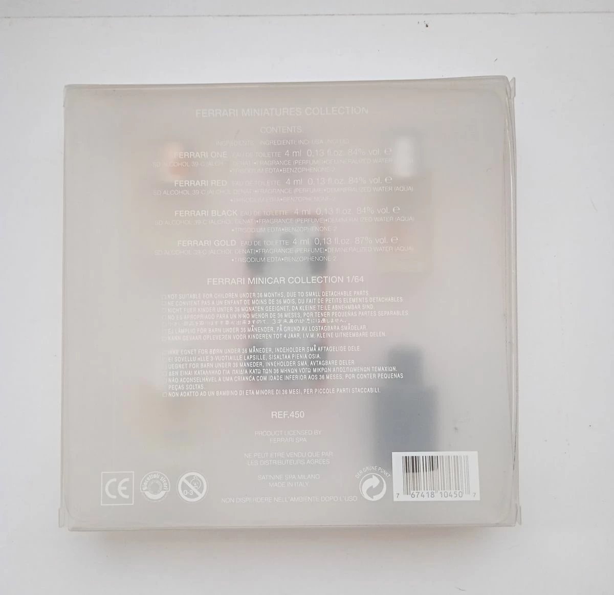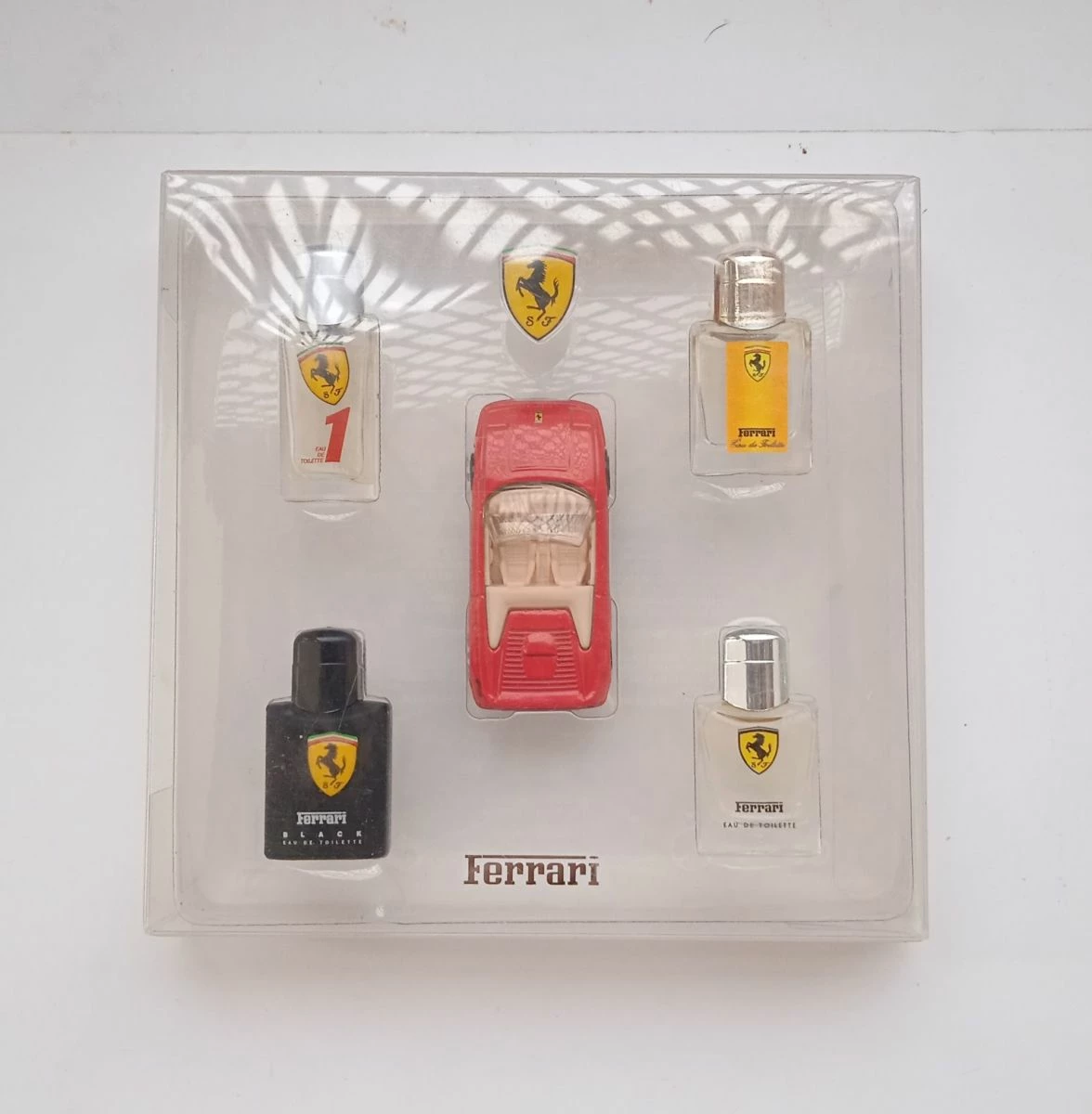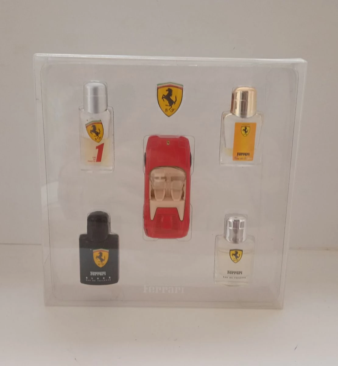 4 Συλλεκτικές μινιατούρες με κολώνιες και ένα κόκκινο αυτοκινητάκι ferrari.