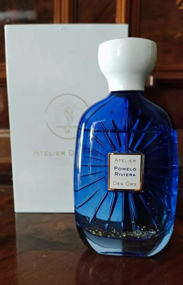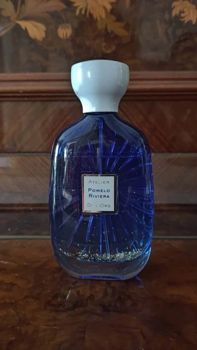 Το φρέσκο και κομψό, με φύλλα χρυσού, Pomelo Riviera του γαλλικού niche οίκου Atelier des ors, μπουκάλι των 100 μλ, λείπουν περίπου 10 μλ, σε προνομιακή τιμή.