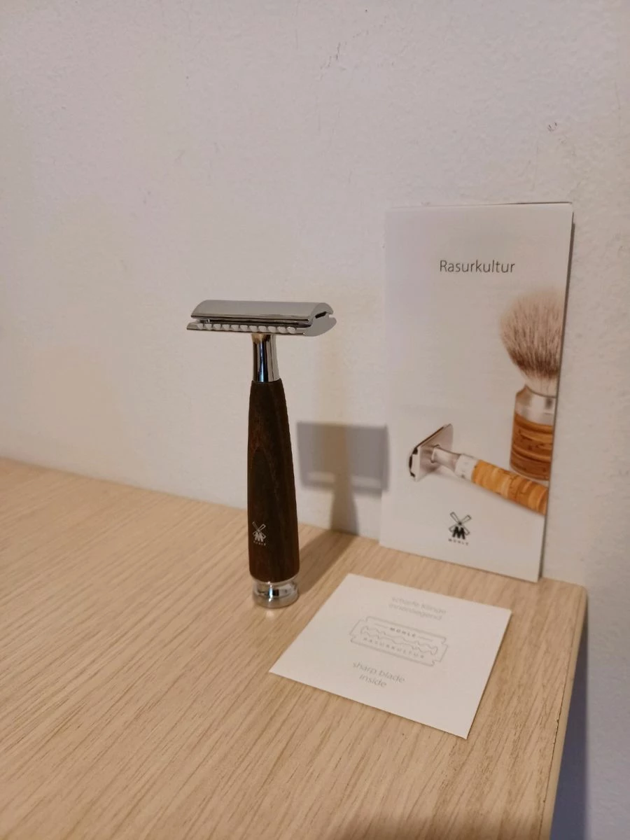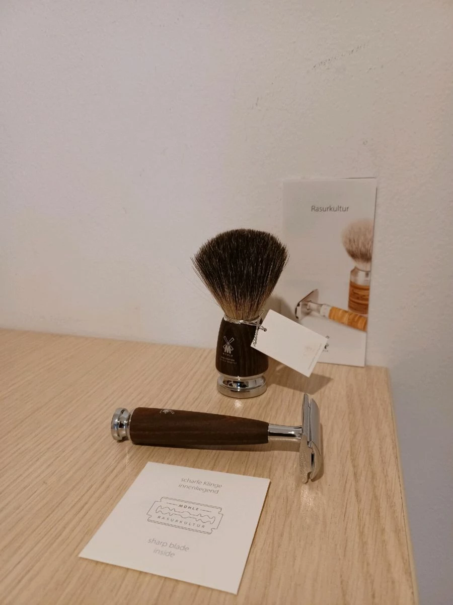 Σετ ξυρίσματος 3 τεμαχίων της Muhle. Το σετ περιλαμβάνει ένα πινέλο ξυρίσματος Pure Badge, ένα stand για το πινέλο και την ξυριστική μηχανή και ένα μπολ ξυρισματος. Η ξυριστική μηχανή είναι Closed Comb (Κλειστό χτένι) και είναι κατάλληλη για καθημερινό ξύρισμα ή για όσους ξυρίζονται τουλάχιστον τρεις (3) φορές την εβδομάδα. Η ξυριστική μηχανή του set είναι κατάλληλη και για αρχάριους.