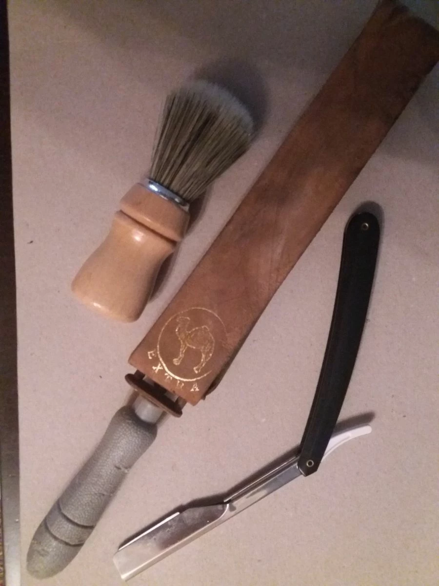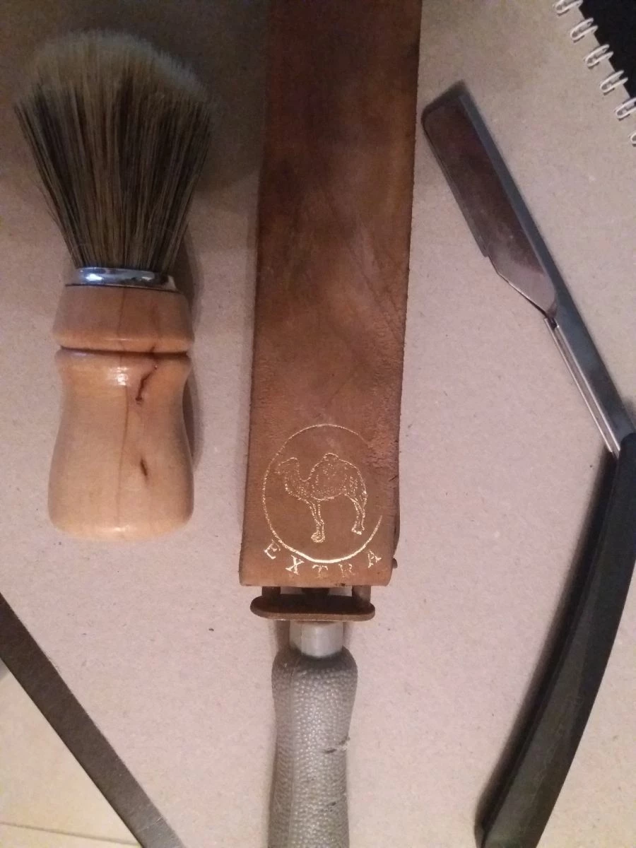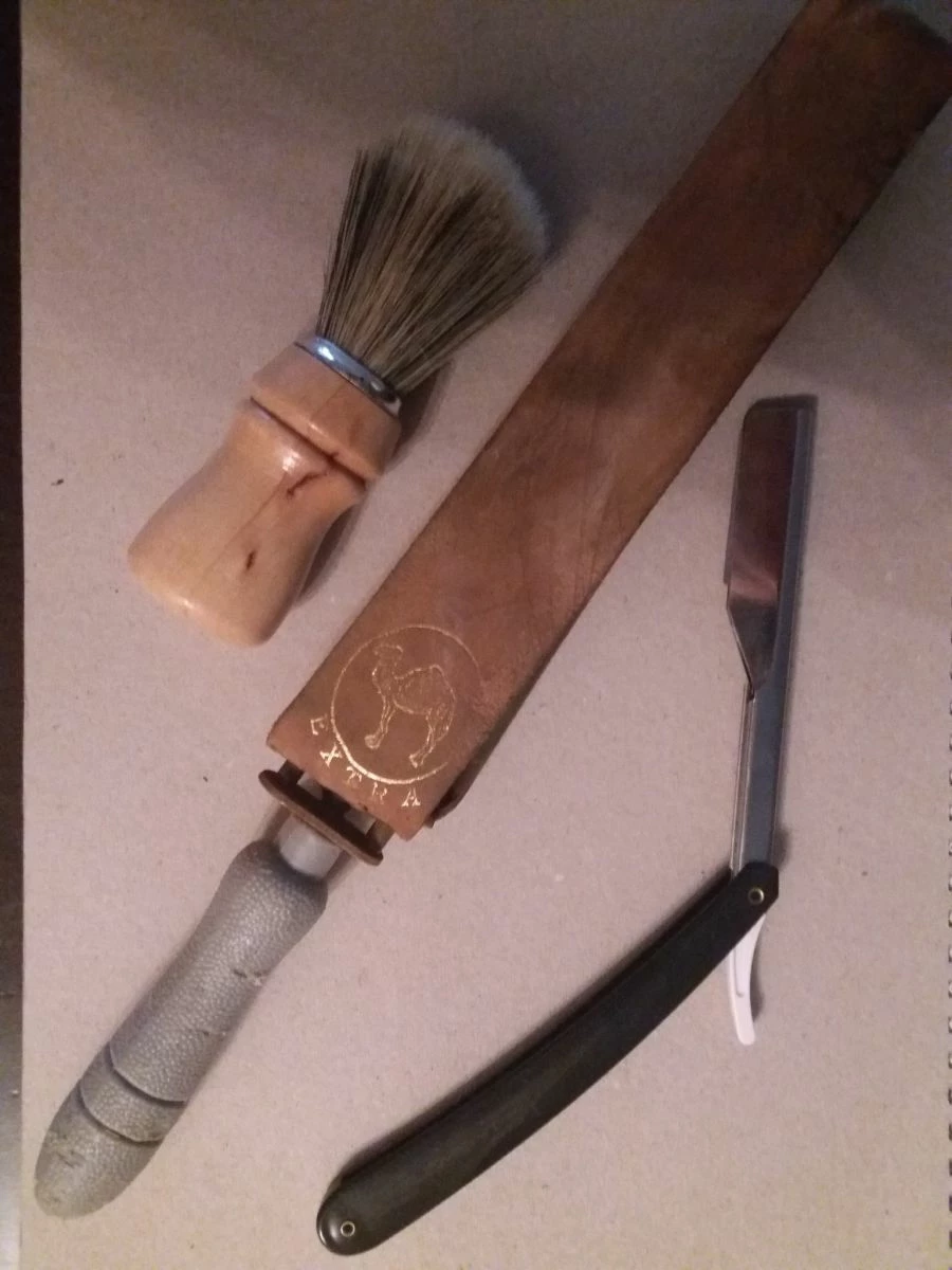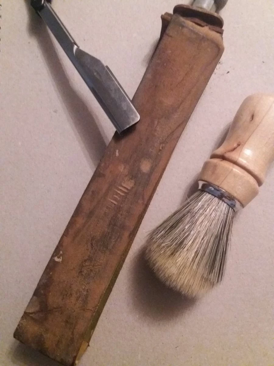 Παλιο σετ ξυραφι, λουρί ακονισματος και βούρτσα – πινέλο για αφρό ξυρίσματος. Σε άριστη κατάσταση. Η μόνη μικρή φθορά λόγω παλαιότητας, όπως φαίνεται στην τελευταία φωτογραφία, το λουρί κοντά στο χερούλι.