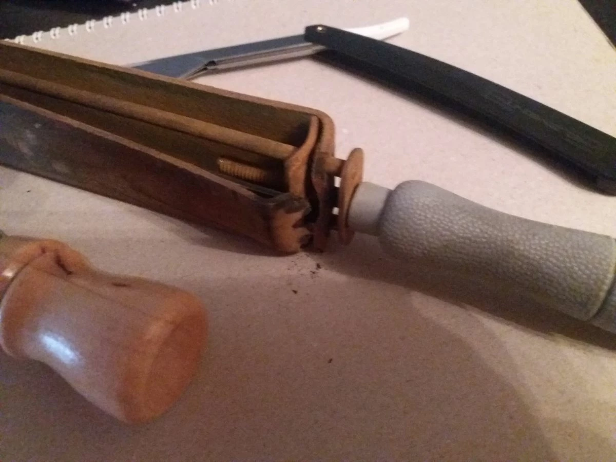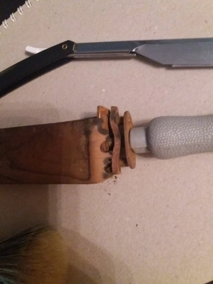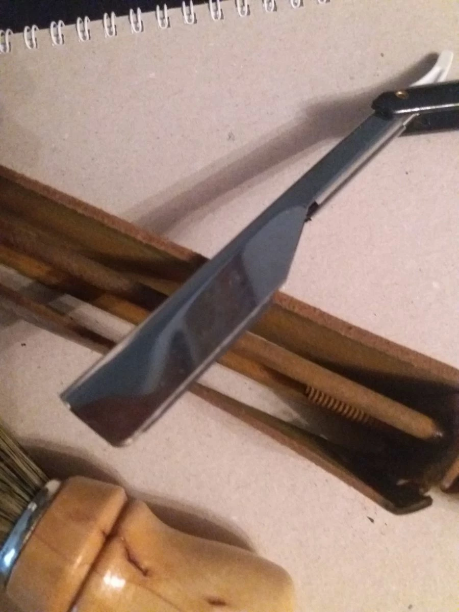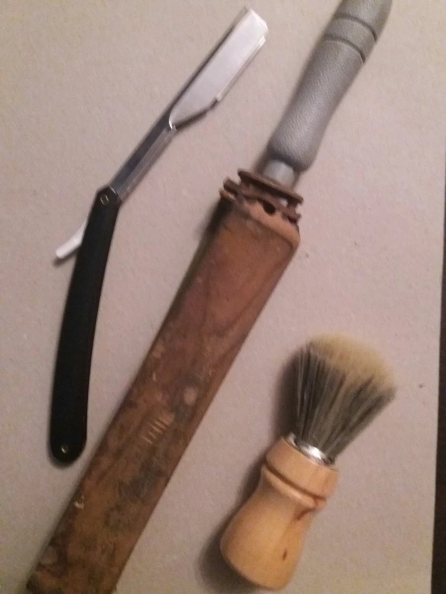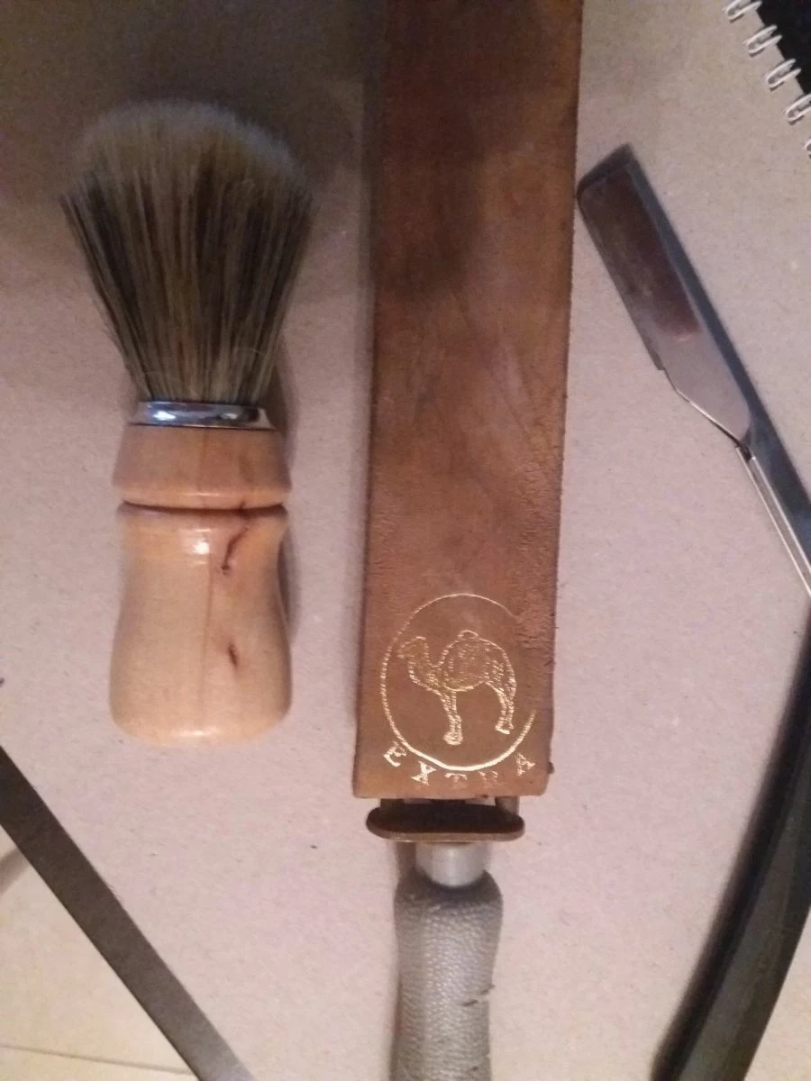 Παλιο σετ ξυραφι, λουρί ακονισματος και βούρτσα – πινέλο για αφρό ξυρίσματος. Σε άριστη κατάσταση. Η μόνη μικρή φθορά λόγω παλαιότητας, όπως φαίνεται στην τελευταία φωτογραφία, το λουρί κοντά στο χερούλι.